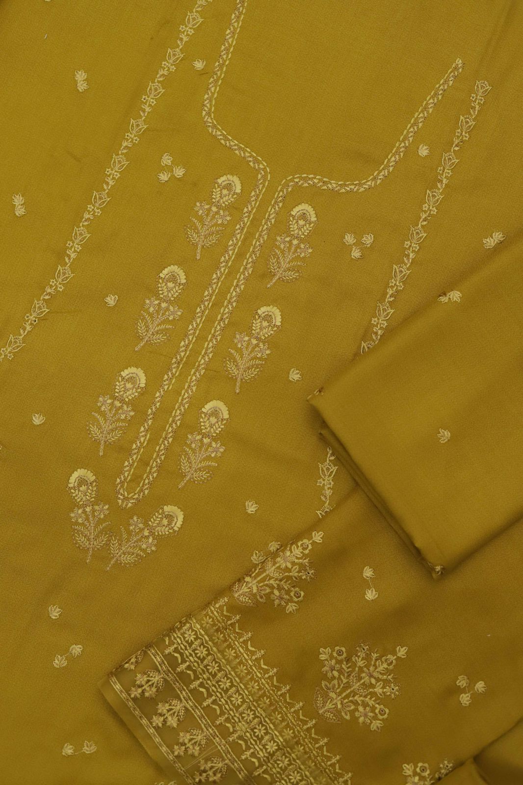 Shirt: Dhanak fabric with full heavy embroidery on the front, back, and sleeves.